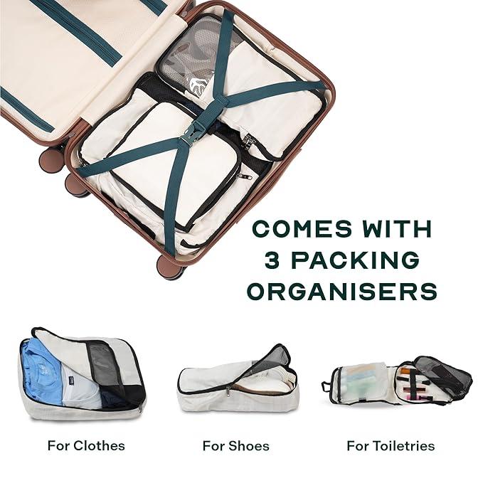 BONUS PACKING ORGANISERS – Comes with 3 free packing cubes to help neatly store clothes, shoes, and toiletries, ensuring a hassle-free travel experience.